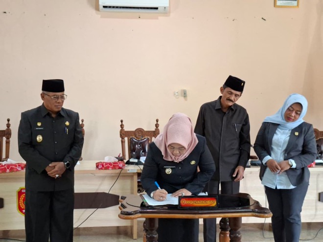Bupati Kobar Nurhidayah menandatangani persetujuan bersama atas tiga Rancangan Peraturan Daerah (Raperda) dalam Rapat Paripurna ke-8 Masa Persidangan I Tahun Sidang 2025/2026, yang digelar di Aula DPRD Kobar, Rabu (26/11)./FOTO: ist